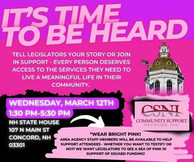 CSNI, alongside numerous other organizations, will be at the NH State House on Wednesday, March 12th from 1:30-5:30 for the public hearing on the Governor's budget. CSNI is grateful to Governor Ayotte for funding the Efficiency budget and continuing to fund the Waitlist. However, workforce struggles are significant, housing problems remain, and families and individuals with disabilities still struggle to access necessary supports. We want to show legislators how important it is to keep funding DD/ABD services. Whether you'd like to share your story through written testimony, spoken testimony, or simply be there in pink to show your support - please join us!